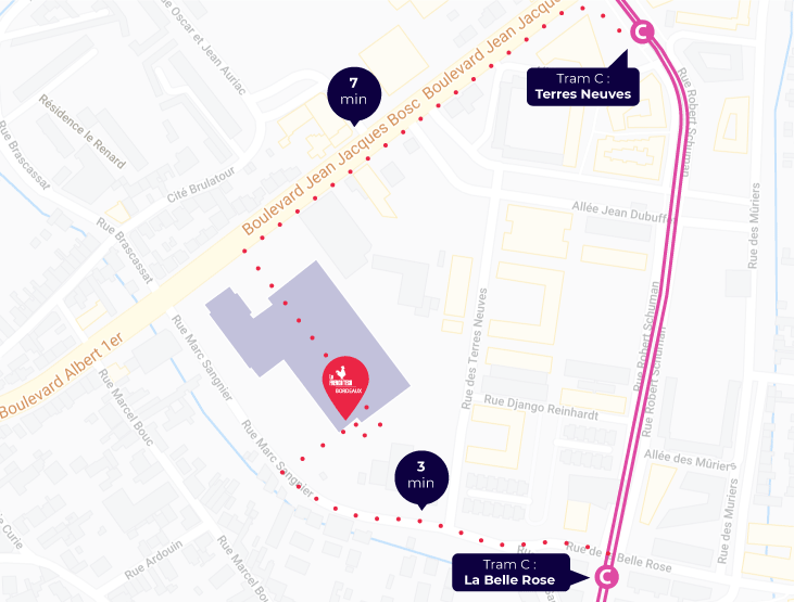 Tram C : arrêts Terres Neuves et Belle Rose à 4 min à pied.
